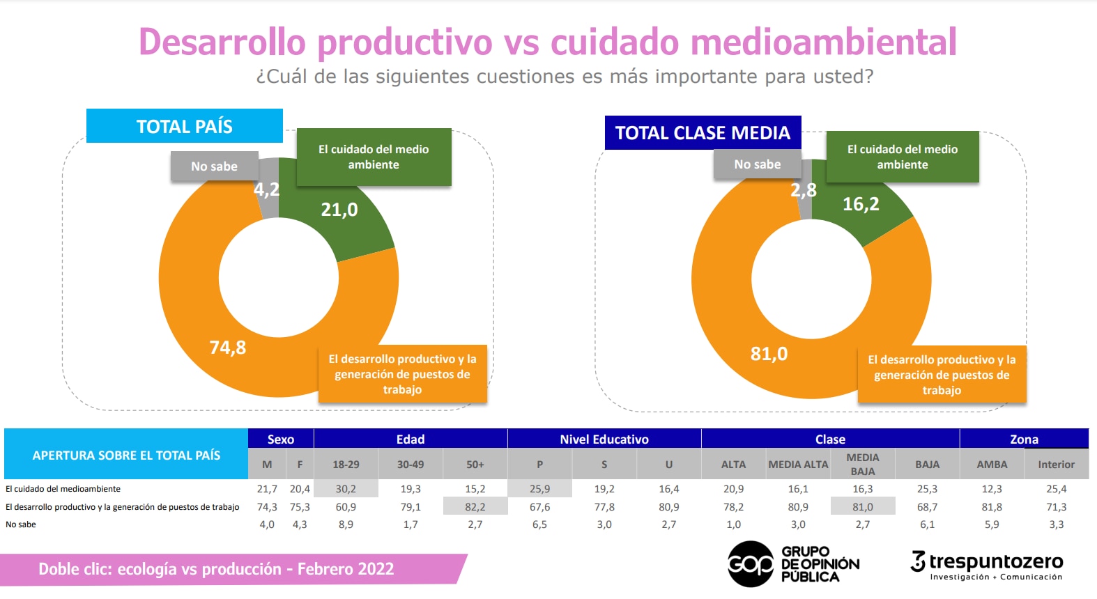 Cuando se les planteó a los encuestados si consideraban más importante el “desarrollo productivo” o el “cuidado medioambiental”, el 74,8% eligió la primera opción, mientras que tan solo el 21% de ellos se inclinó por la segunda y el 4,2% prefirió no responder.
