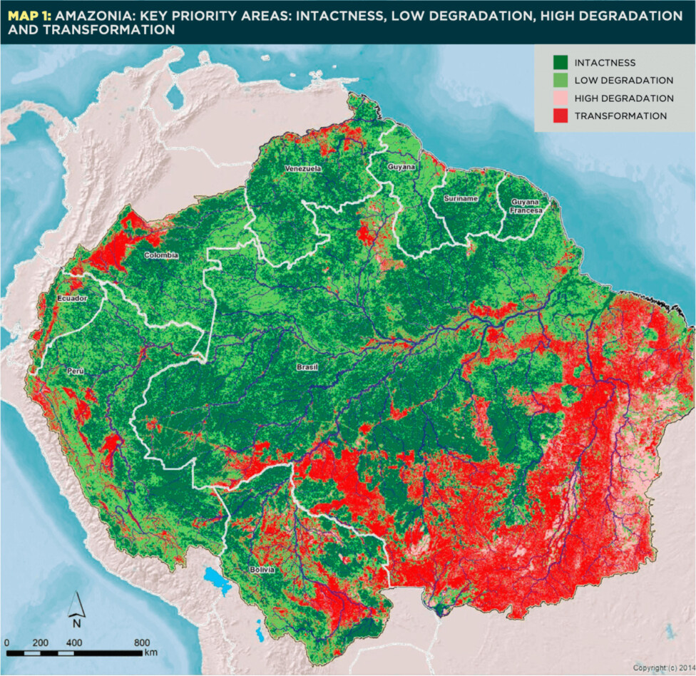 Según las organizaciones conservacionistas, se ha perdido hasta un 20 % de la selva, mientras que una superficie similar se degradó a causa de actividades humanas, como la agricultura, la ganadería, la tala y la minería.
